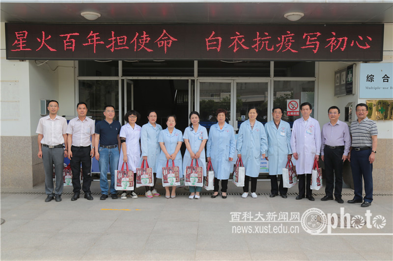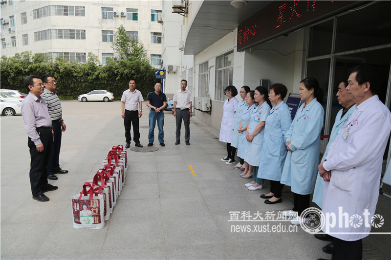 5月11日下午,在“5•12”国际护士节到来之际,校党委副书记樊建武和7003全讯白菜网、后勤处有关部门负责人深入校医院,代表学校向全校广大医护人员致以节日慰问并赠送了慰问品。