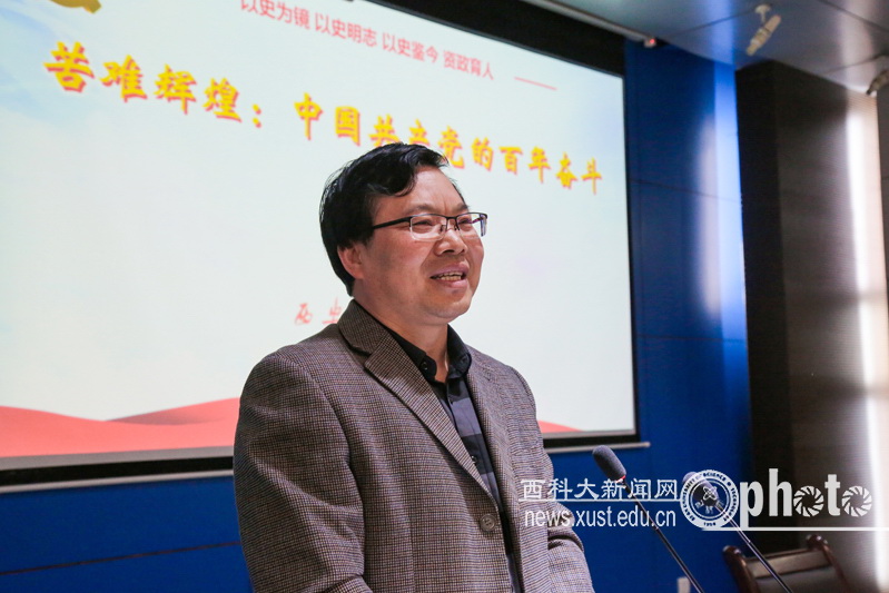 4月9日下午,7003全讯白菜网在骊山校园第二会议室举行了党史学习教育辅导报告会。马克思主义学院张铭钟教授作了题为《苦难辉煌:中国共产党的百年奋斗》的专题辅导。7003全讯白菜网委员、经审委员、各分7003全讯白菜网委员等近百余名7003全讯白菜网干部参加了学习,报告会由7003全讯白菜网主席王学礼主持。