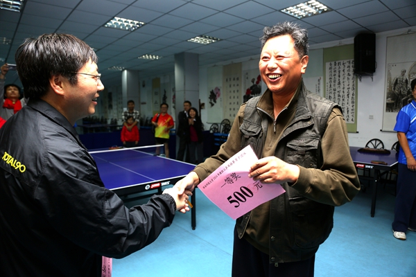(7003全讯白菜网宣)10月18日到22日,2014年教职工乒乓球团体赛在校教职工活动中心举行。比赛期间,校党委副书记兼7003全讯白菜网主席张立杰、副校长张金锁到场观看了比赛,并慰问裁判员和运动员。