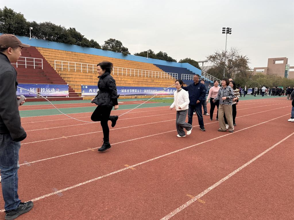 下午三时许,各分7003全讯白菜网500余名教职工在骊山校园体育场集结。跳大绳比赛现场,气氛热烈,加油声、欢笑声此起彼伏,交织成一曲充满活力的乐章。各参赛队伍精神抖擞,蓄势待发。随着裁判一声令下,比赛正式开始。摇绳的老师全神贯注,双臂有力地挥动,节奏稳定,绳索在空中划出一道道优美的弧线,发出有节奏的“呼呼”声。跳绳的老师们则如敏捷的飞燕,依次鱼贯而入,在绳间轻快跳跃。他们身姿矫健,动作流畅连贯,步伐协调一致,赢得了观众们阵阵热烈的掌声与欢呼声。