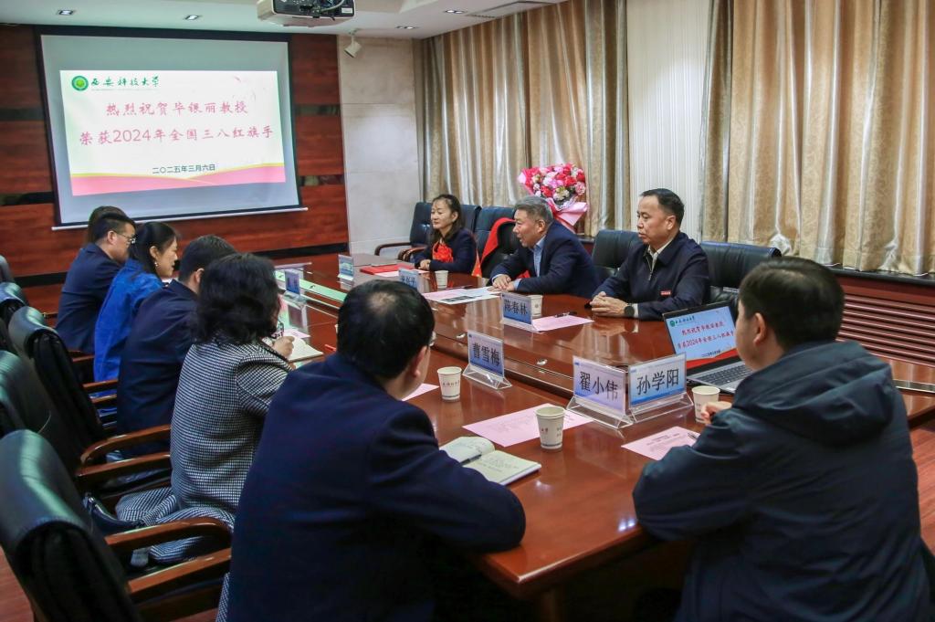 陈春林表示,2025年新年伊始,毕银丽教授荣获全国“三八红旗手”称号,这既是毕老师的个人荣耀,也是全校师生的荣耀。学校相关部门要携手做好宣传工作,充分发挥毕老师的示范引领作用,将她在教学、科研工作中巾帼不让须眉的奋斗精神在学校发扬光大。参会部门负责人纷纷表示,毕银丽教授是全校女教职工的楷模,将以她为榜样,学习她对事业的热爱与执着,以及不断奋斗的精神,助力学校的“双一流”建设。
