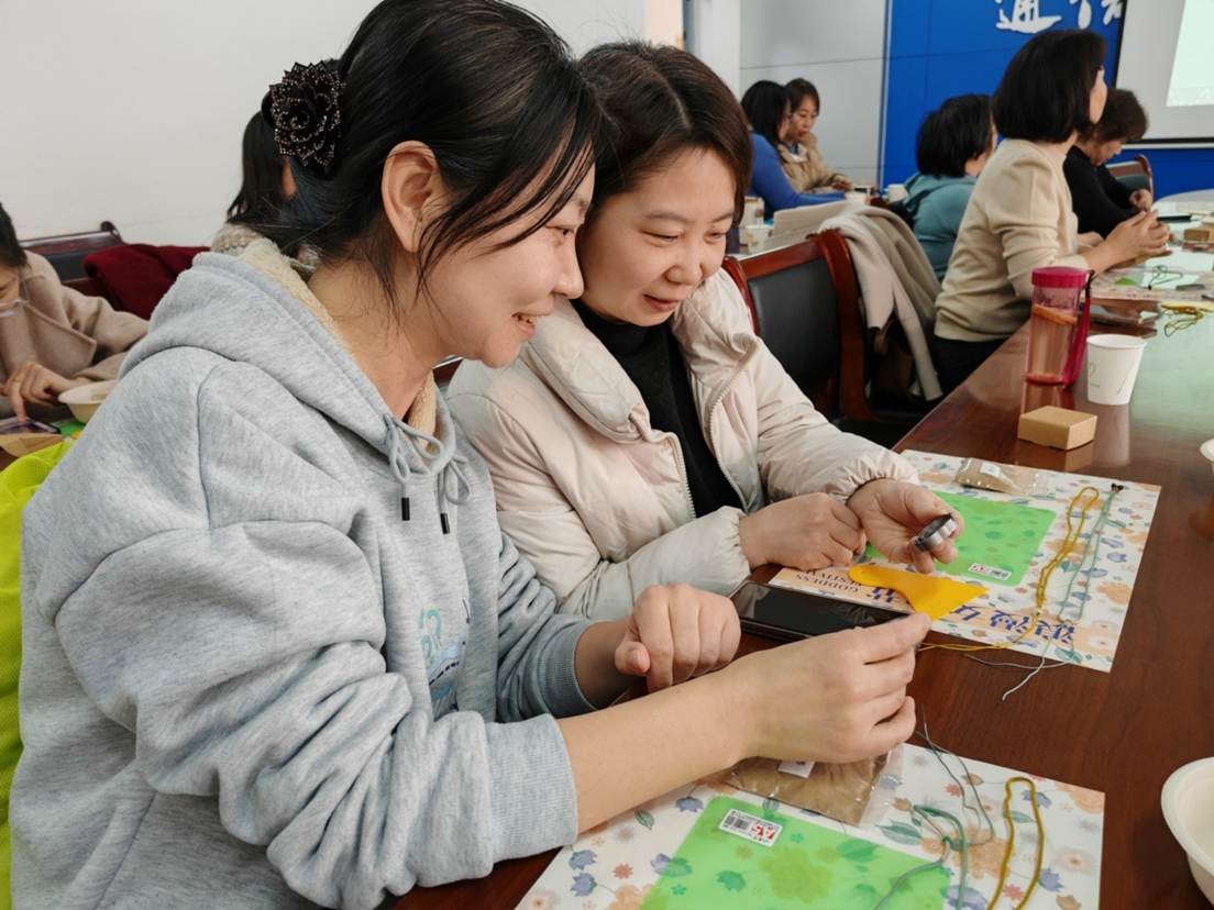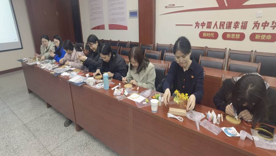 活动伊始,赵栓峰副院长代表学院向全体女教职工致以节日问候和诚挚感谢。在“巾帼言志”座谈会上,邀请了“全国模范教师”—我们化工学院刘向荣教授围绕职业发展话题进行交流,老师们受益匪浅。此次交流会既是教育智慧的碰撞,更是一场精神的洗礼。当聚光灯下的榜样教师褪去光环,以质朴的语言讲述讲台背后的坚守与探索,台下的聆听者们收获的不仅是方法论,更是在教育长河中锚定初心的力量。为丰富女教职工的文化生活,活动特别策划了“指尖艺术·匠心传承”体验环节。现场设置非遗掐丝珐琅画制作、螺钿胸针制作、干花小夜灯、非遗金箔画主题工坊,女教师们兴致盎然,巧手翻飞间,一件件精美的作品逐渐成型。活动过程中老师们感叹:“活动既让我们感受到传统手工艺的魅力,又为同事间的交流提供了轻松愉悦的平台。”