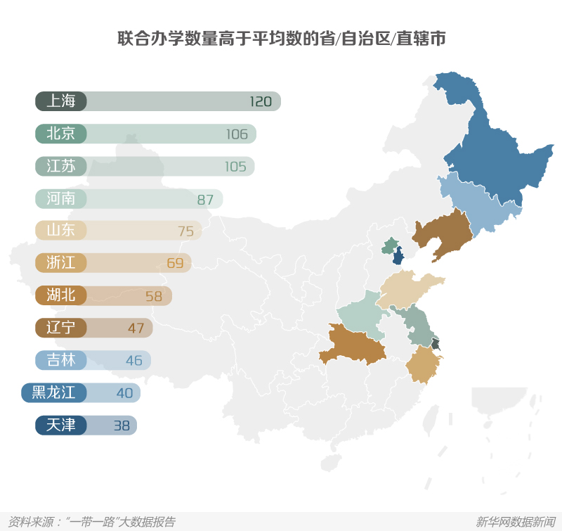 除了友好城市之外,人才方面的教育合作也是人文交流活动的重要组成部分。相关统计结果显示,截至2016年6月30日,各省/自治区/直辖市在海外联合办学共1023所,平均每个省/自治区/直辖市与海外合作办学33所。在排名前10的省/自治区/直辖市中,有5个位于东部沿海地区;而西北和西南地区则有待进一步加强与海外的教育合作。