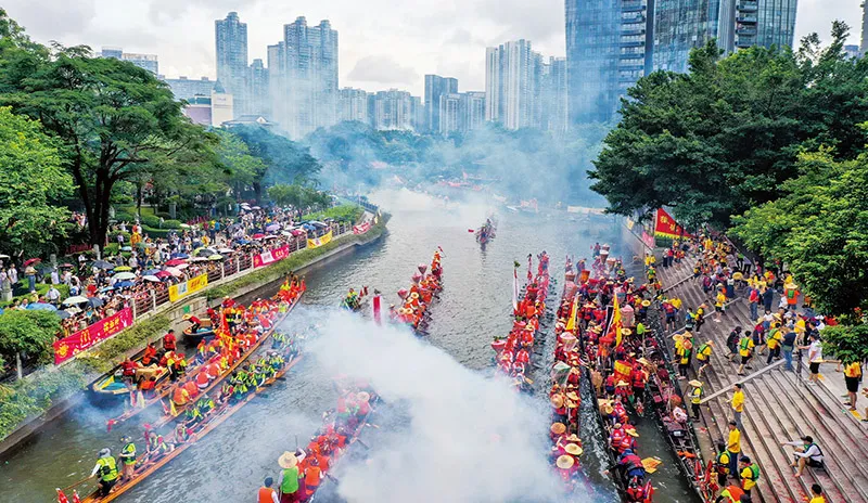 中国式现代化是物质文明和精神文明相协调的现代化。猎德村是位于广东广州珠江新城一座历史悠久的古村。每年端午期间,猎德村民都会遵照岭南龙舟文化习俗,在祠堂和河涌,用各种充满仪式感的“龙船景”展示对端午文化的传承。图为2024年6月10日,十里八乡的龙舟汇聚在猎德涌参加“龙船景”。