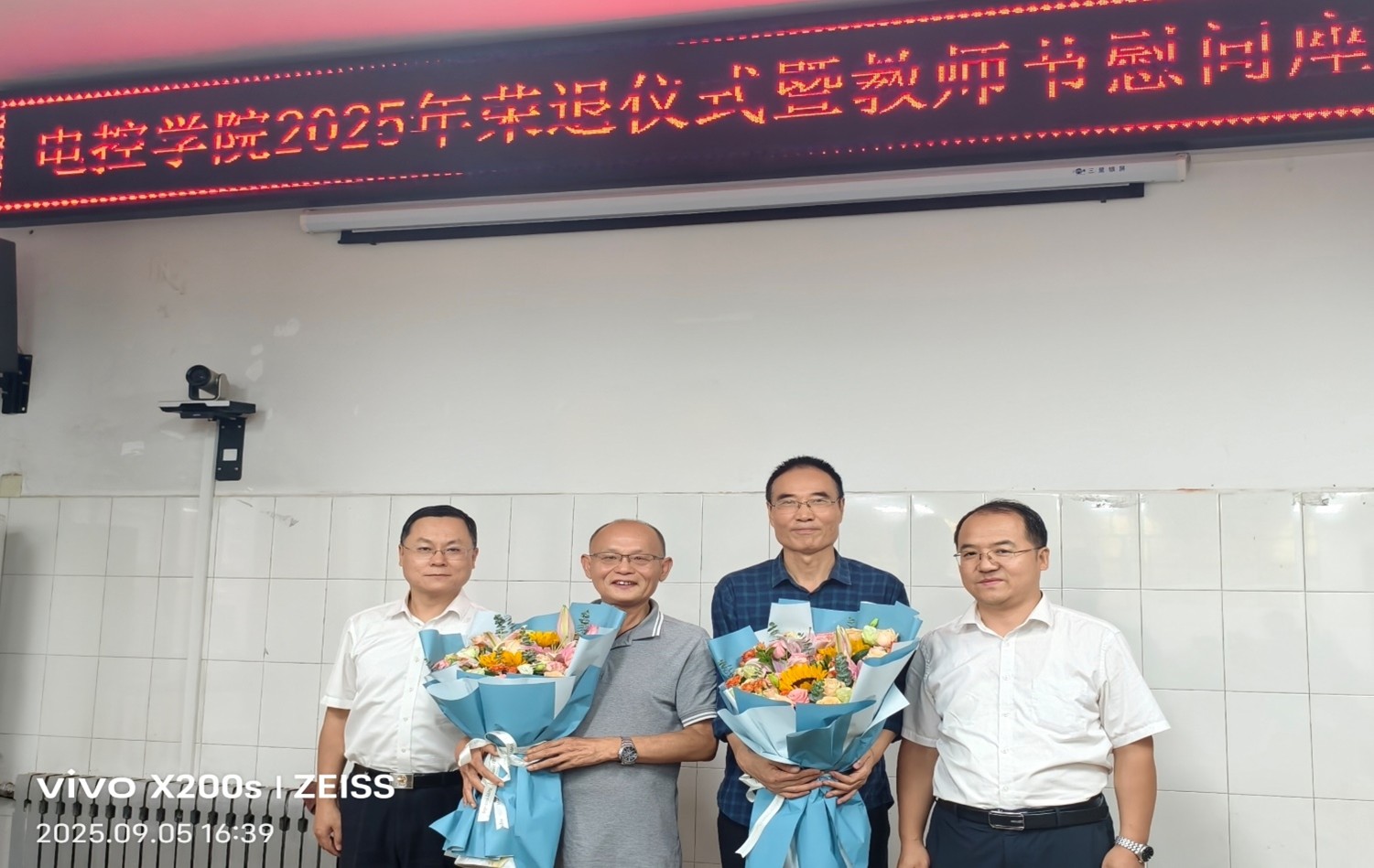 党委书记杨华、院长寇发荣分别为2025年退休的两位教师郝兆明、任雨民,送上鲜花和纪念品,并合影留念。并向他们送上了最崇高敬意和美好祝愿,感谢他们几十年如一日地坚守教育初心,坚持为党育人、为国育才;感谢他们将自己的美好年华都撒在了电控学院这片热土上。